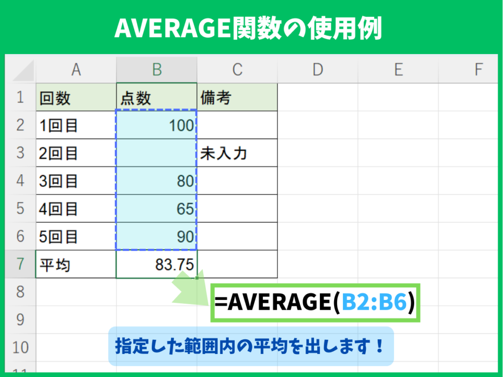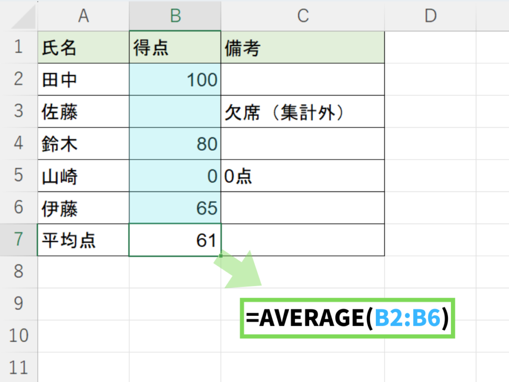 • 空白のセル:計算から除外される(平均に影響しない)