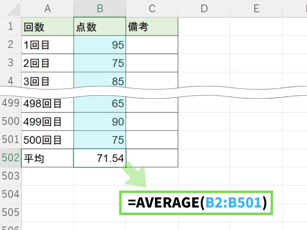 =AVERAGE(B2:B501)