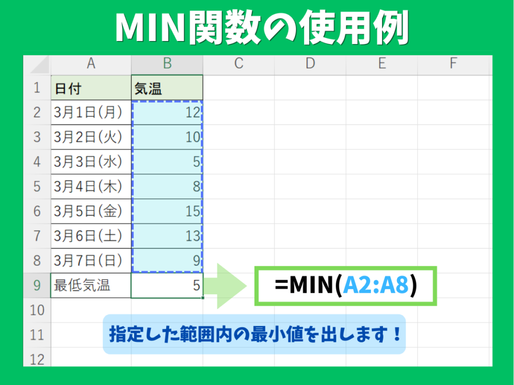 MIN関数なら、範囲を指定するだけで一瞬で最小値をキャッチします。