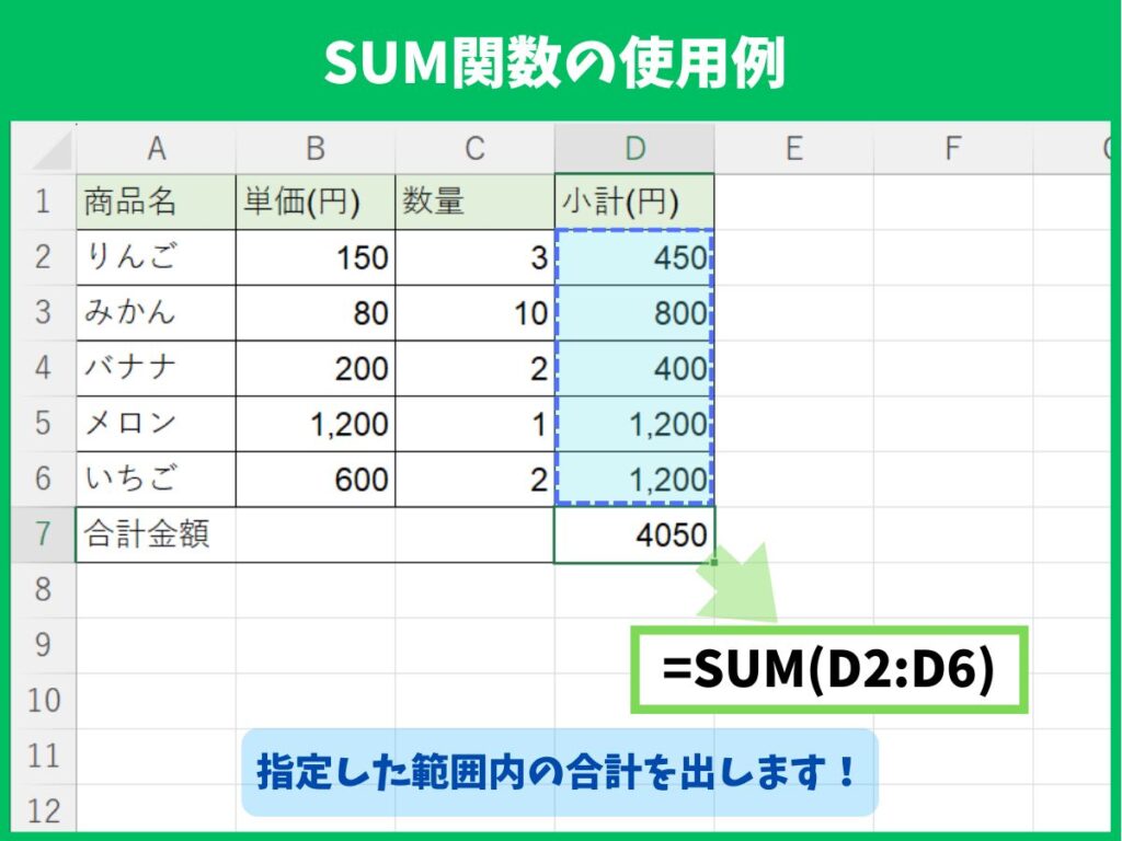 SUM関数は、Excelで最も基本かつ使用頻度の高い関数 です。