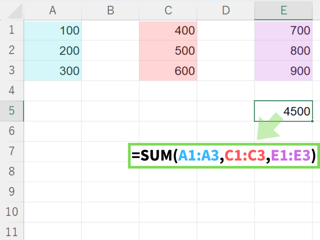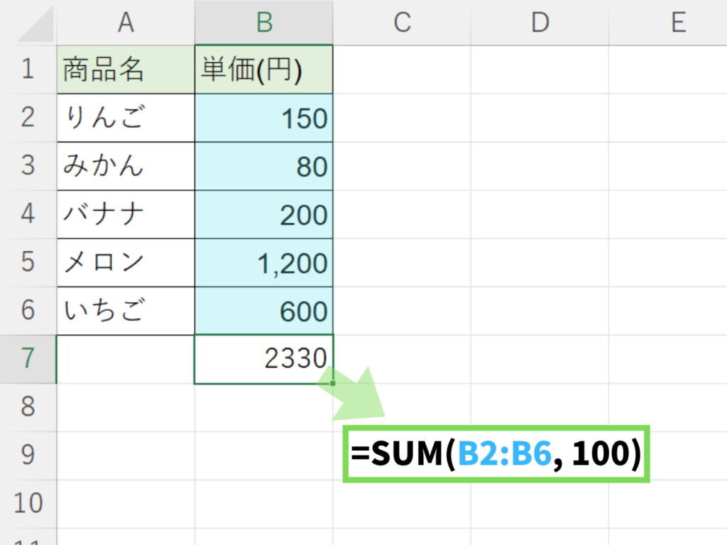 SUM関数では、セルだけでなく数値そのものも計算対象 にできます。